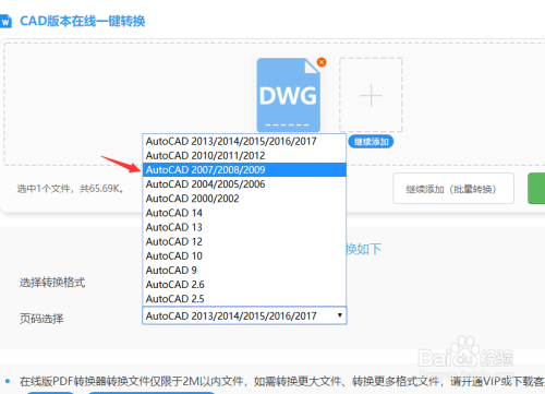 点击下三角按钮弹出选择框,选择AutoCAD2007/2008/2009并起头转换。