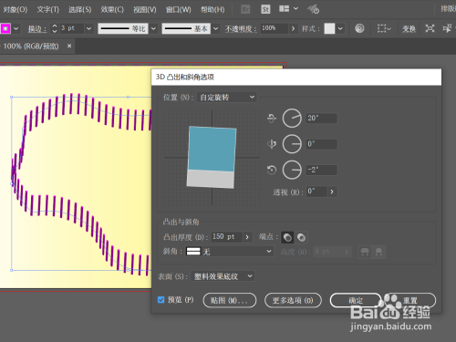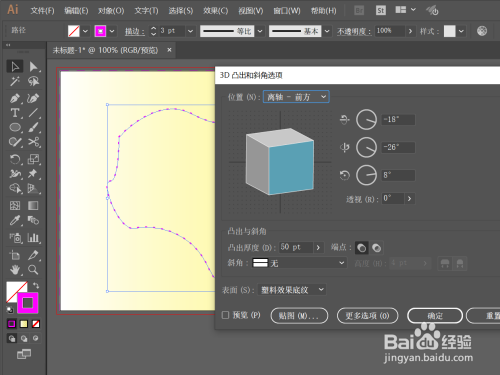 回到本家儿页面,选择该虚线封锁路径,经由过程结果-3D-凸出和斜角,进入凸出和斜角设置窗口;