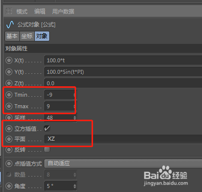 将属性中的“Tmin”、“Tmax”数值别离设置为-9,9。勾选上“立方差值”选项,将“公式”的平面偏向XY调整当作XZ偏向。