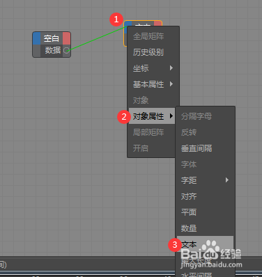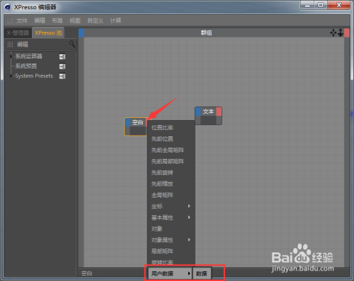 3、在弹出的XPresso面板中,将空白对象和文本对象拖入面板中,在空白对象右上角处点击鼠标左键不松,在弹出的选项中依次选择“用户数据”-“数据”。再将小圆圈拉出一条线毗连到文本对象,在弹出的选项中选择“对象属性”-“文本”。则透视图中的文本就被替代当作了时候(10s)。