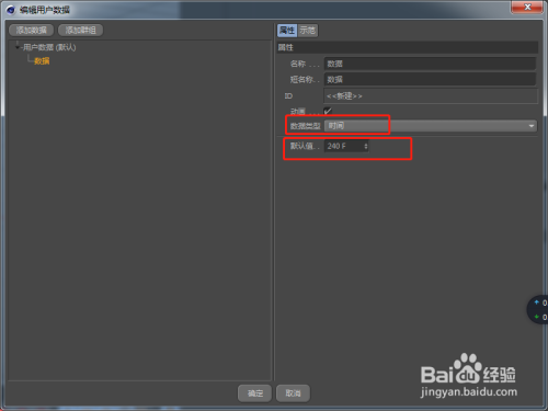 打开C4D软件,在对象框中建立一个空白对象,在空白对象属性面板中依次选择“用户数据”-“增添用户数据”,在弹出的用户数据面板中,“数据类型”选择“时候”,默认值输入240帧(即10s)。