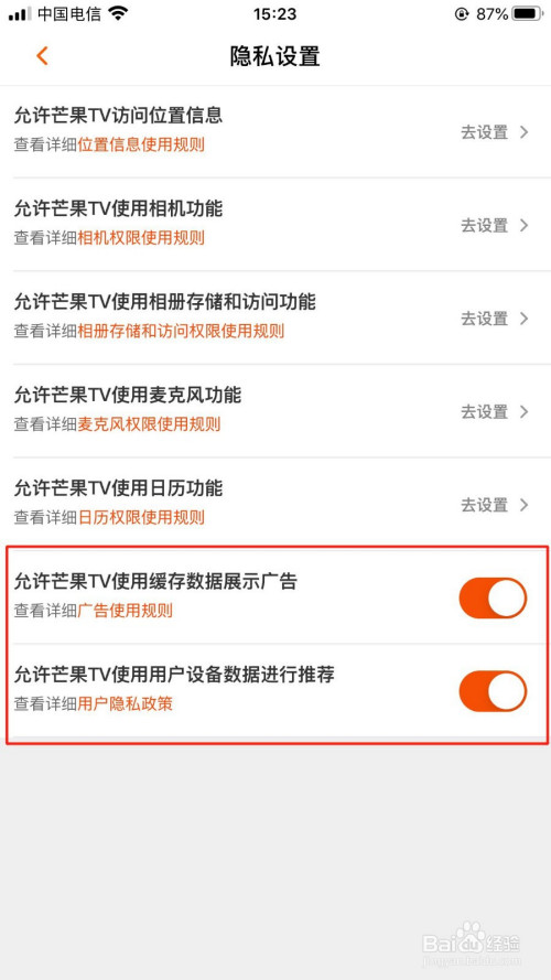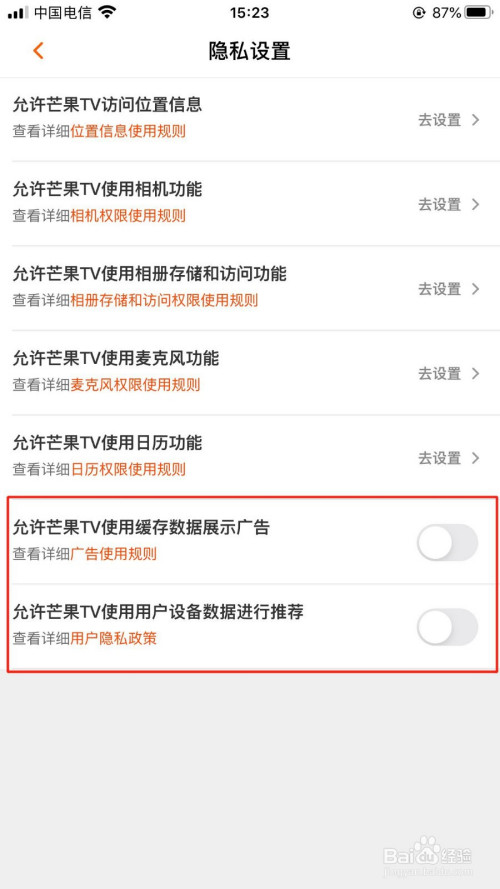 在“隐私设置”界面中,打消勾选“许可芒果TV利用缓存数据展示告白”和“许可芒果TV利用用户设备数据进行保举”选项的勾选开关。