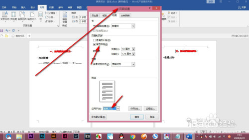 4.然后打开页面设置,找到首页分歧,应用于这篇文档,点击确定。