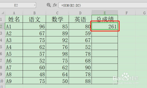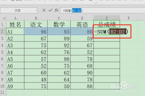 可以看到单位格有了sum函数公式,在公式里面选择乞降的区域,然后按Enter键