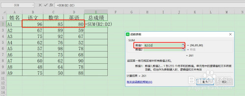 数值1选择需要相加的单位格,这里需要相加的是B2:D2