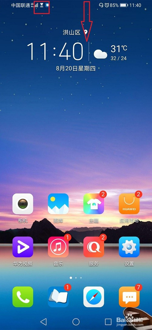 第一步打开我们的手机,可以看到手机顶部有一个沙漏图标,呈现沙漏图标的原因是开启了健康利用手机