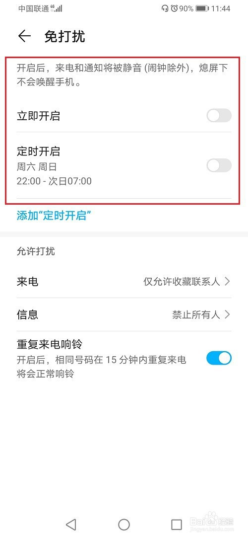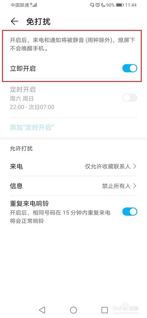第四步进去华为手机免打搅之后,可以看到是开启的