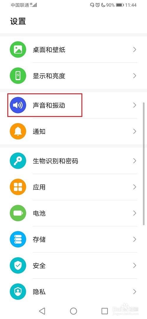 第二步下面来封闭华为手机顶部的月亮图标,点击设置,然后点击声音和振动