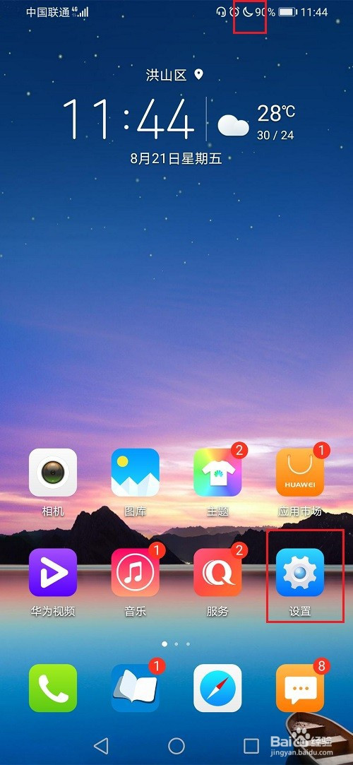 第一步打开华为手机,可以看到顶部有一个月亮图标,呈现月亮图标的原因是因为开启了免打搅模式
