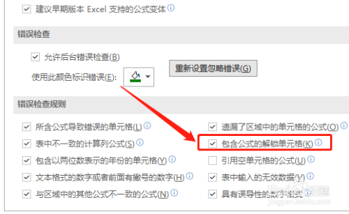 2.在“错误查抄法则”中,选中“包含公式的解锁单位格”选项。
