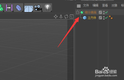 接着,我们需要将细分曲面东西设置为该立方体的父级,如下图所示。