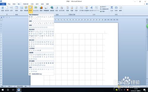 第一步:打开Word2010,调出方格网格线,单击“插入”选项卡,在“插图”组中选择“外形”按钮。