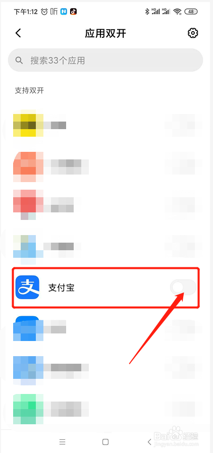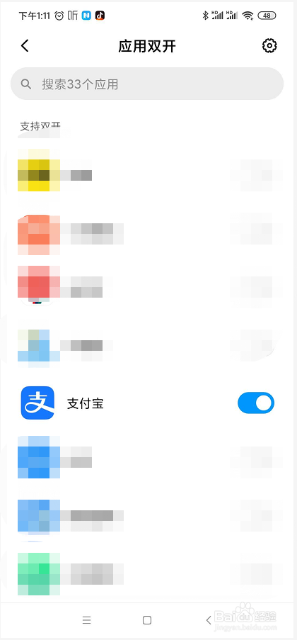在找到支付宝应用后,对应的应用图标后有一个双选开关。我们点击一下双选开关,使能双开功能后双选开关则变为蓝色