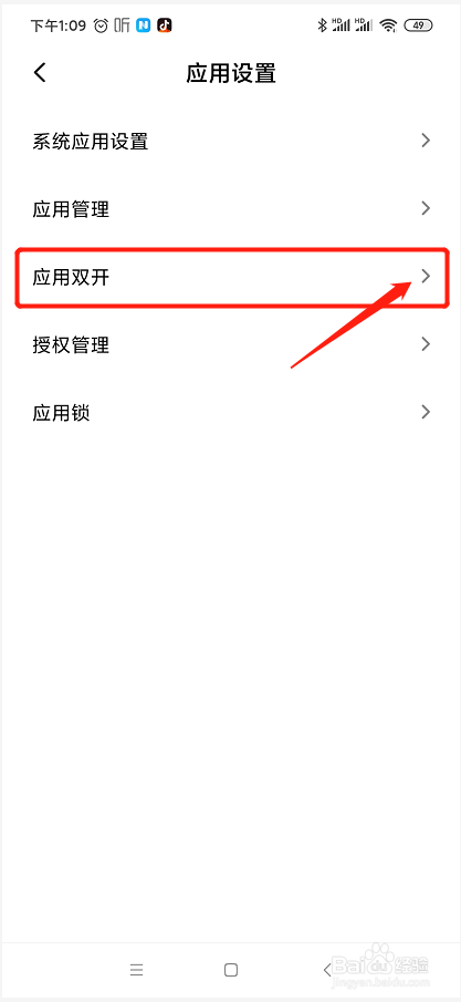 在打开的应用设置界面中,我们选择此中的“应用双开”图标,并点击图标后的‘>’控件,我们可进入应用双开的设置界面