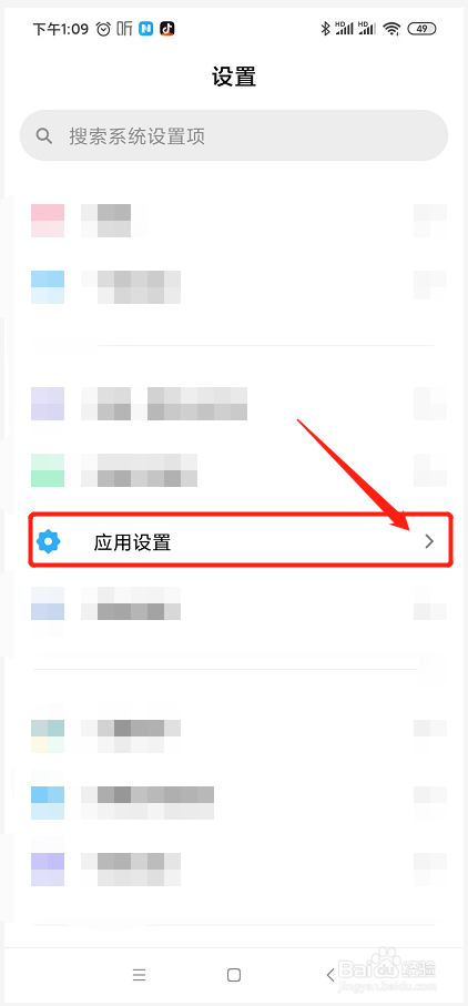进入手机的系统设置应用的界面后,系统将当前手机的系统设置使命以列表列出,我们在列出的应用使命中找到”应用设置“,点击厥后的'>'进入应用设置子界面
