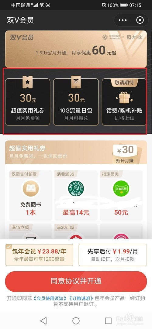 第五步下滑到底部,可以看到双V会员详情,点击赞成和谈并开通,可以开通双V会员利用