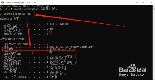 3、输入 ipconfig -all ,回车;即可查看到 ip 地址和 mac 地址