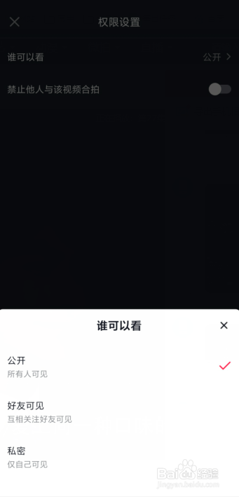 6.在弹出窗口中选择公开、老友可见或私密权限即可。