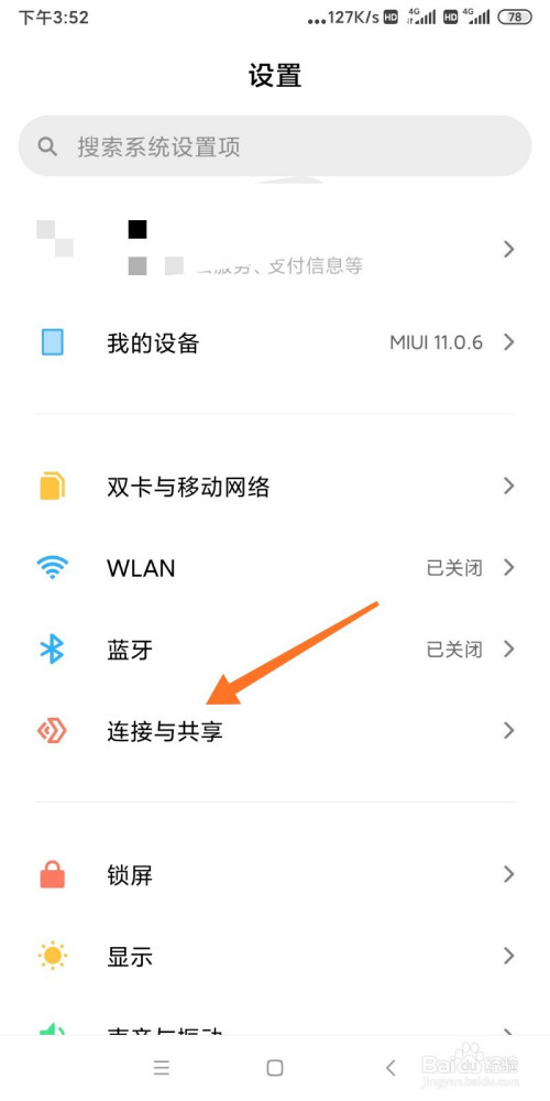 然后在设置栏面前目今点击按钮【毗连与共享】。