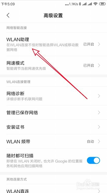 接下来在打开的高级设置页面,找到wlan助理的设置项。