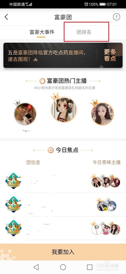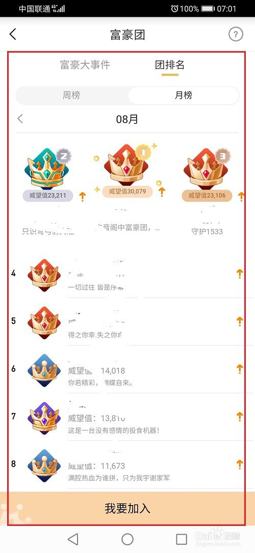 第五步点击月榜,可以看到富豪团月排名,按照需要查看