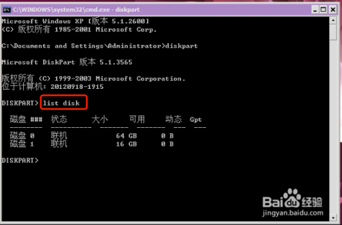 切换到DISKPART号令,键盘输入list disk,之后按回车,如图所示