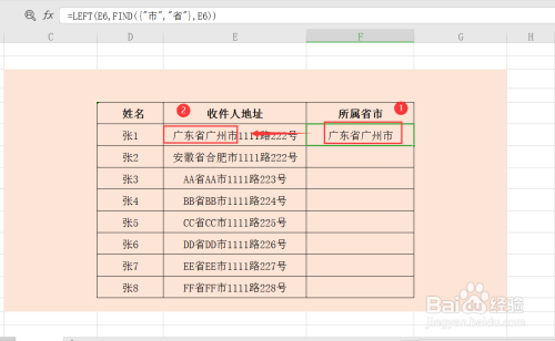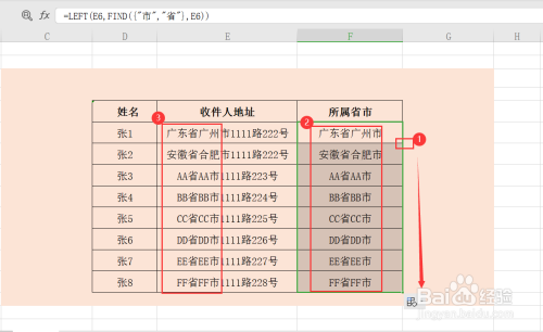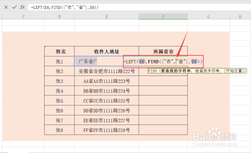 第四步,领会函数的利用方式后,F6单位格输入计较公式,=LEFT(E6,FIND({"市","省"},E6)),意为从单位格最左边起头,截取地址中的省市信息;