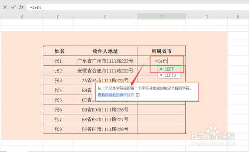 第三步,单位格中输入本次计较需要利用的函数2,=LEFT,查看其利用法则,详情如下;