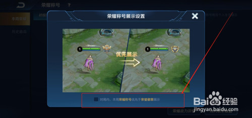 5、在弹出框中,勾选上“对局内,本周荣耀称号优先于声誉徽章展示”