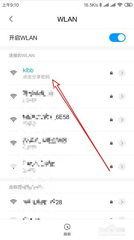 在打开的wlan页面,点击当前WiFi链接下面的点击分享密码的链接。