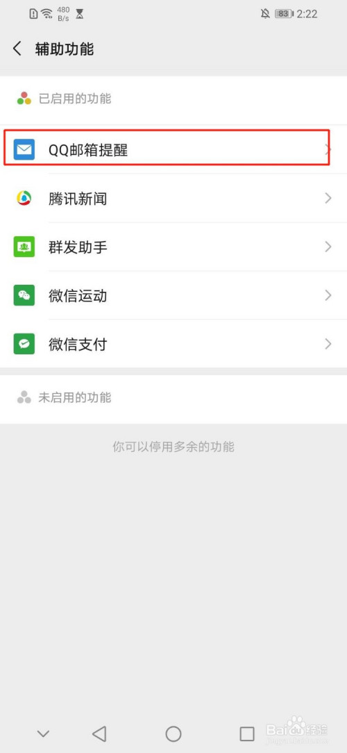 进入“辅助功能”界面后,点击“辅助功能”界面第一行的“QQ邮箱提醒”,如图