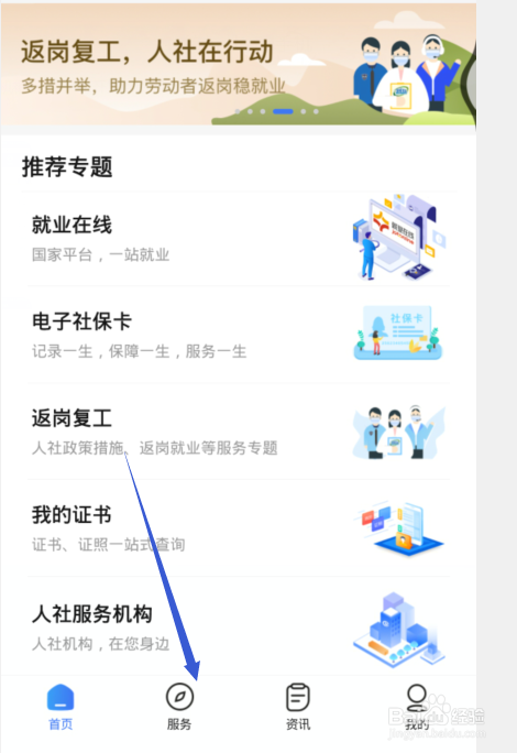 - 掌上12333客户端首页点击下方的【办事】