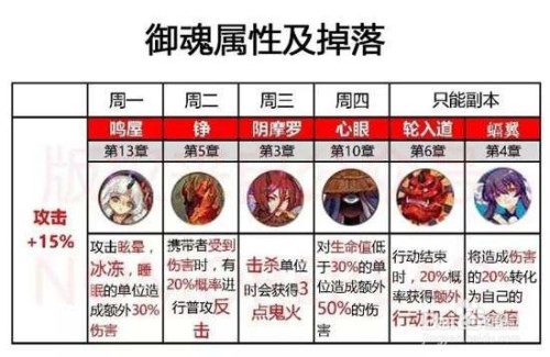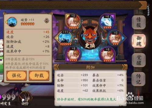 三号位御魂则是左边右下角的御魂,第一条属性是固定加当作,四号位御魂则是右下角位置的御魂,和二号位一样第一条属性是百分比加当作。