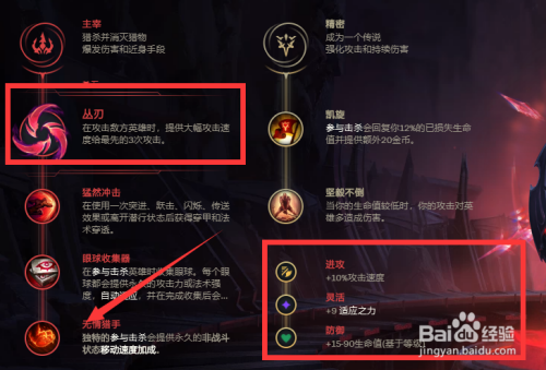 【3】副系“比力多变——可以带蓦地冲击和无情猎手,也可带双回血或大招CD”,小符文带“攻速——顺应之力或护甲——生命值即可”;