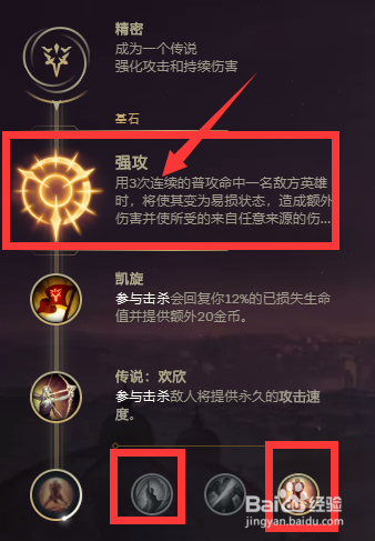 首先潘森,“既可以辅助也可以一路吃兵”,符文“必需点三环——强攻——凯旋——欢欣——刚毅不倒或致命一击,因为Q可以蓄力所以可以带致命一击”,如图所示;