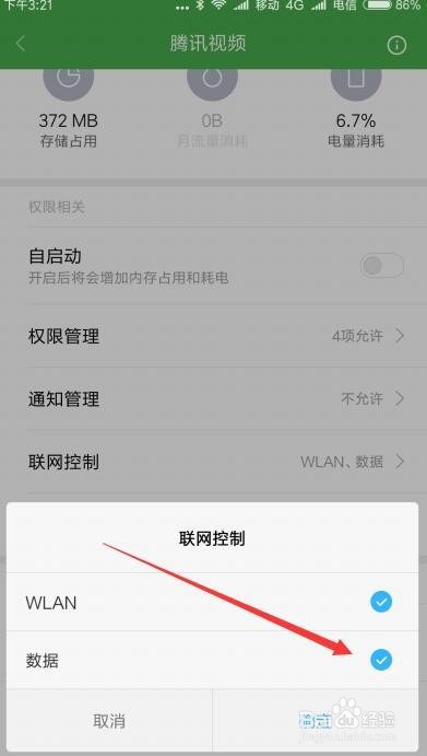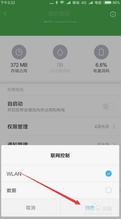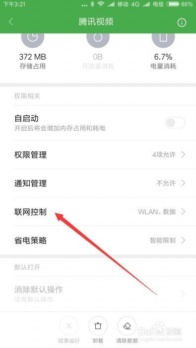 点击后会打开应用的详情页面,点击联网节制的设置项。