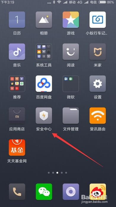 在手机屏幕上摆布滑动,点击平安中间的图标。