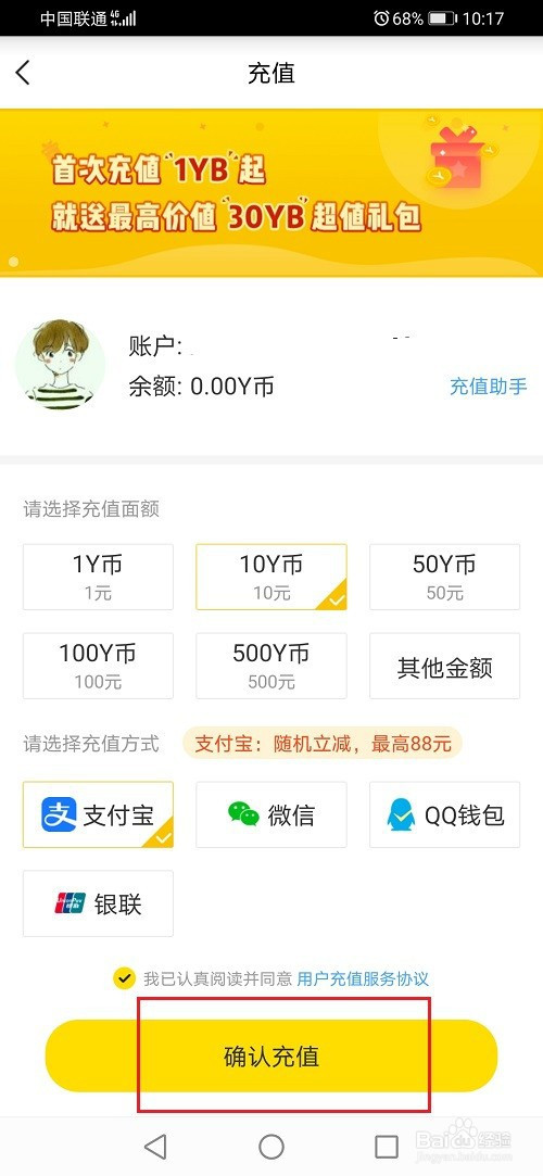 第四步进去之后,选摘要充值的y币数目,点击确认充值