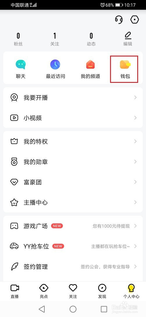 第二步进去yy小我中间之后,点击钱包