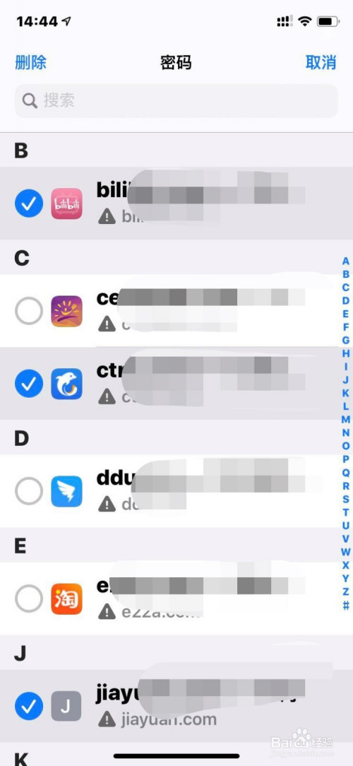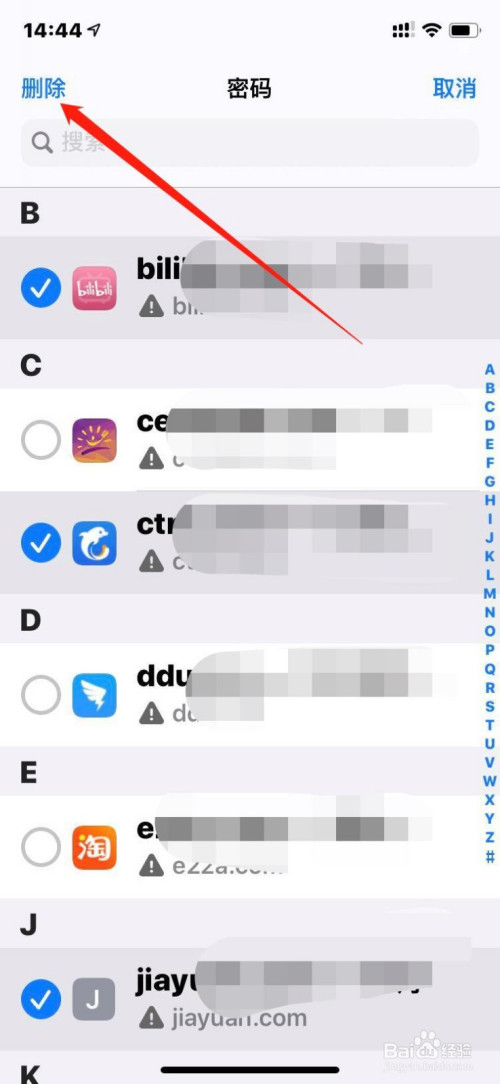 所有的密码条今朝面呈现选择圆框,选择需要删除的