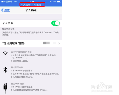 打开“小我热点”,毗连设备后,iPhone 屏幕顶部会呈现一个蓝色的条带,如图所示: