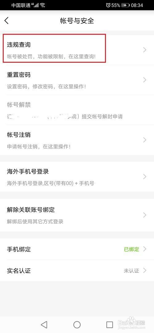 第三步在帐号与平安中,点击违规查询