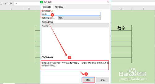 第三步,进入插入函数页面后,搜刮code函数,查看其用途后,点击确定;