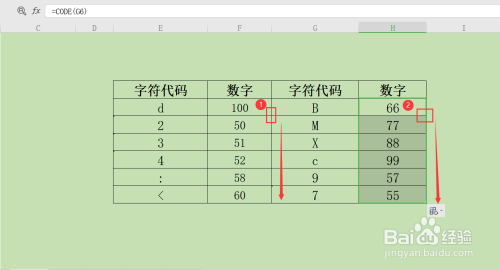 第六步,计较出字符“d”的数字后,我们将鼠标移动到单位格右下角,标的目的下拉动单位格,完当作批量计较,H列操作体例一致,输出成果如下图所示,即为完当作字符代码转换为数字操作。