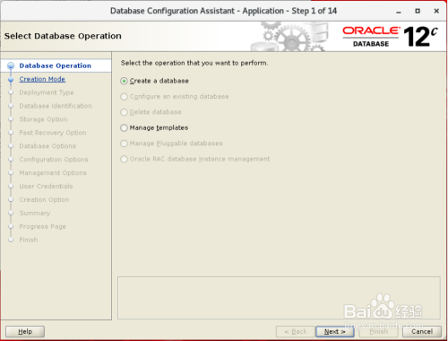 第一步,登录到linux情况,并切换到oracle用户下,执行dbca,调出图形化界面,然后选择crate a database(建立数据库,一般为默认),点击next进入下一步;