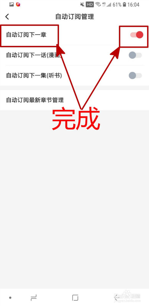 当开关开启酿成红色,起点念书APP主动订阅下一章就设置完当作了。