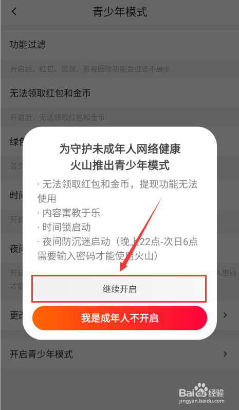 【6】在打开的“为守护未当作年人收集健康火山推出青少年模式”对话框,点击“继续开启”并按照提醒即可开启青少年模式。