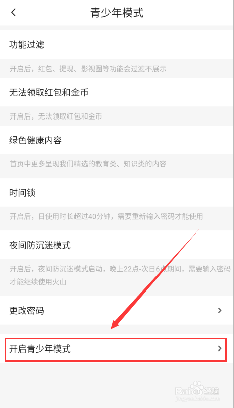 【5】在“青少年模式”页面上,点击“开启青少年模式”地点行肆意位置