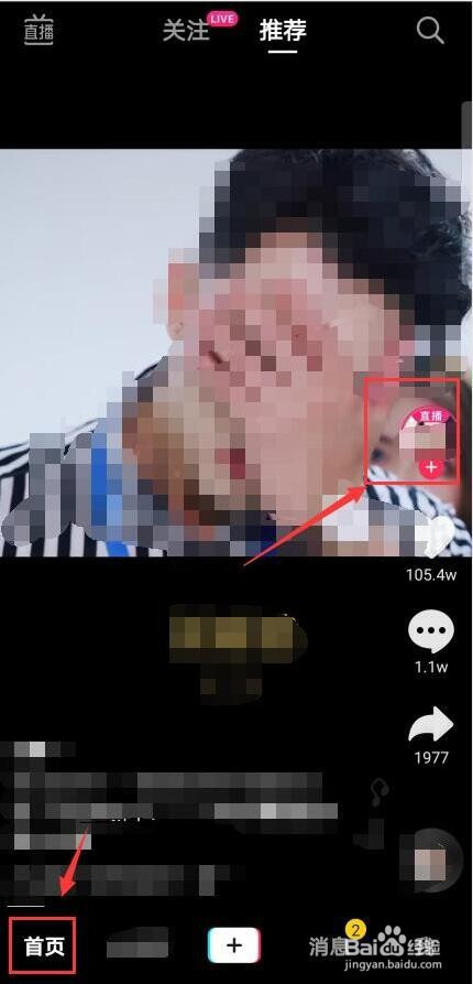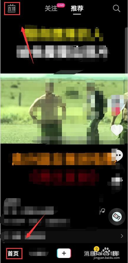 打开抖音,进入抖音本家儿界面,点击【首页】然后点击左上角的【直播】