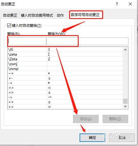 在“键入时主动套用公式”中,设定自界说替代内容,并添加即可。如图: